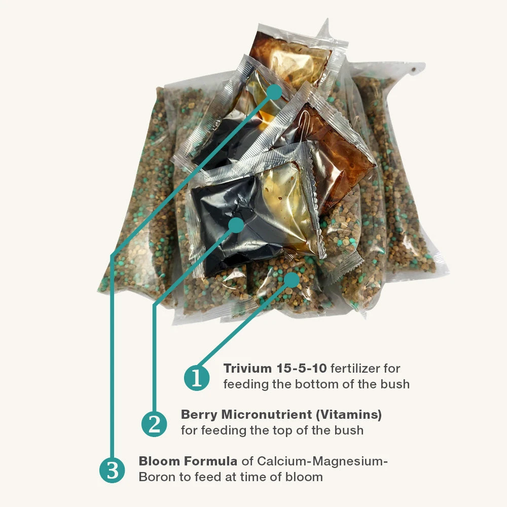 This kit includes everything you need to support your berry bushes throughout the growing season, with ingredients designed by expert growers: