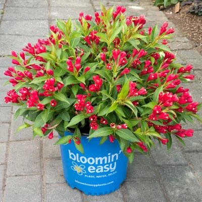 Container gardens are all the rage for busy gardeners ?… and for good reasons. They can feature single as well as multiple plants; they’re easy to care for; and they solve many landscape challenges. Perhaps you don’t like to dig holes and keep your plants weeded ‘– containers solve both these problems. Or maybe you want to grow a plant that needs full sun ‘– like Weigela Crimson Kisses® ‘– but your yard is mostly shady. If you have a sunny patio or balcony, you can grow your potted plant there ‘– another problem solved! Choose a large container for Weigela Crimson Kisses®. As it grows, it produces multiple stems from around the base until mature plants have the dense growth that supports a ton of flowers. And while it’s still small, you can fill in the pot by planting colorful annuals and other sun-loving plants.
